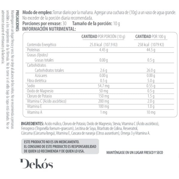 Ácido málico, Cloruro de Potasio, Oxido de Magnesio, Stevia, Vitamina C (Ácido ascórbico), Fenogreco (Trigonella foenum-graecum), Lecitina de Soya, Bitartrato de Colina, Resveratrol, Cúrcuma (Cúrcuma Longa), Vitamina E, Cascara de Naranja (Citrus aurantium), Omega 3 y Vitamina A.